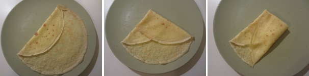5. FAGOTTINO. Piegate all’interno tre lati della crespella per creare una specie di triangolo, quindi piegate all’interno gli angoli superiori.